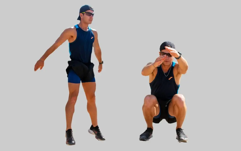 - Desde una posición de pie, lleva tu cuerpo a una posición de sentadilla.