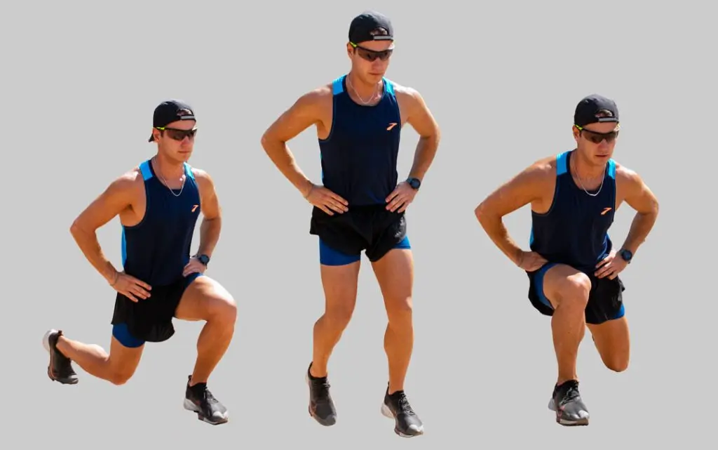 - Comienza en una zancada normal con tu peso distribuido uniformemente.